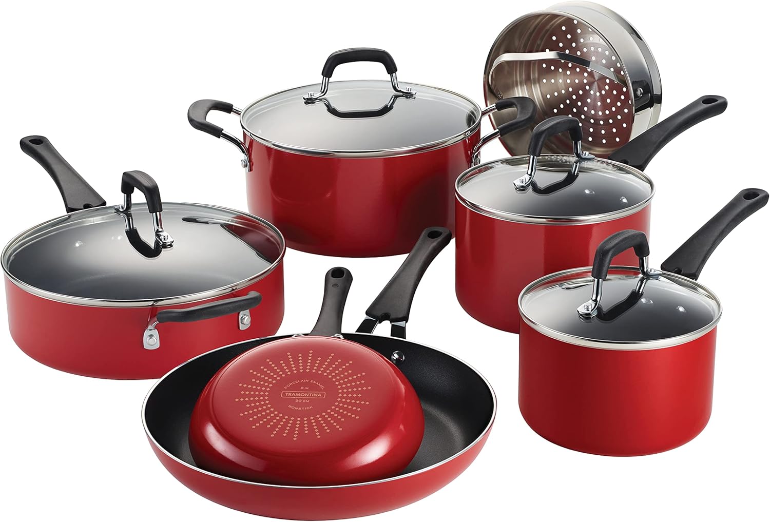 The Tramontina 11-Piece Nonstick Cookware Set is your perfect kitchen companion for everyday cooking. Designed with both performance and convenience in mind, this versatile set includes essential pots and pans that help you handle meals of any size. With a vibrant porcelain enamel exterior and durable heavy-gauge aluminum core, it offers fast, even heating—perfect for browning, searing, or simmering.