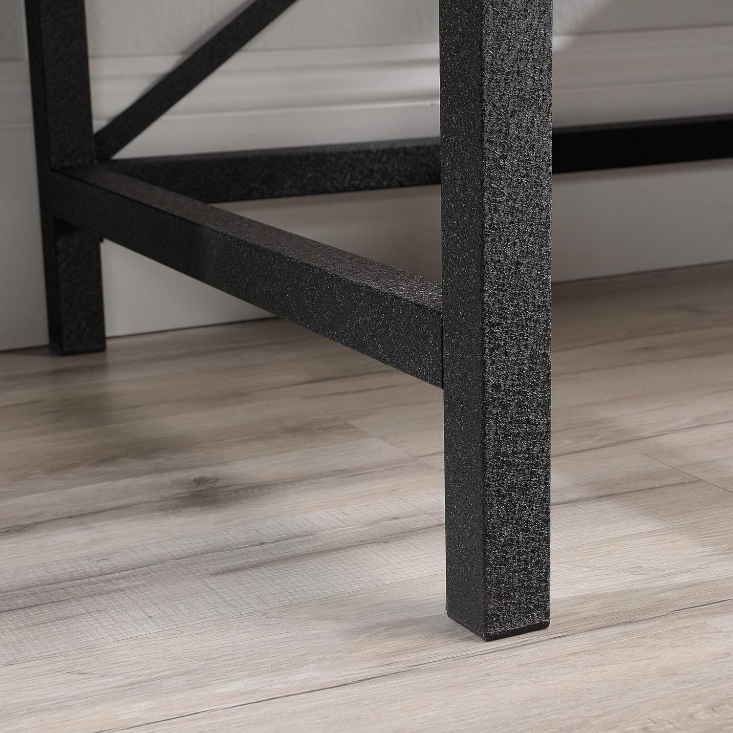 Built to last, this desk is supported by a sturdy textured metal frame with corner accents and rear crossbars for extra stability. Finished on all sides, it looks great from any angle, making it versatile for placement in any room. Combining style, storage, and durability, this desk is the perfect upgrade for your home office setup.