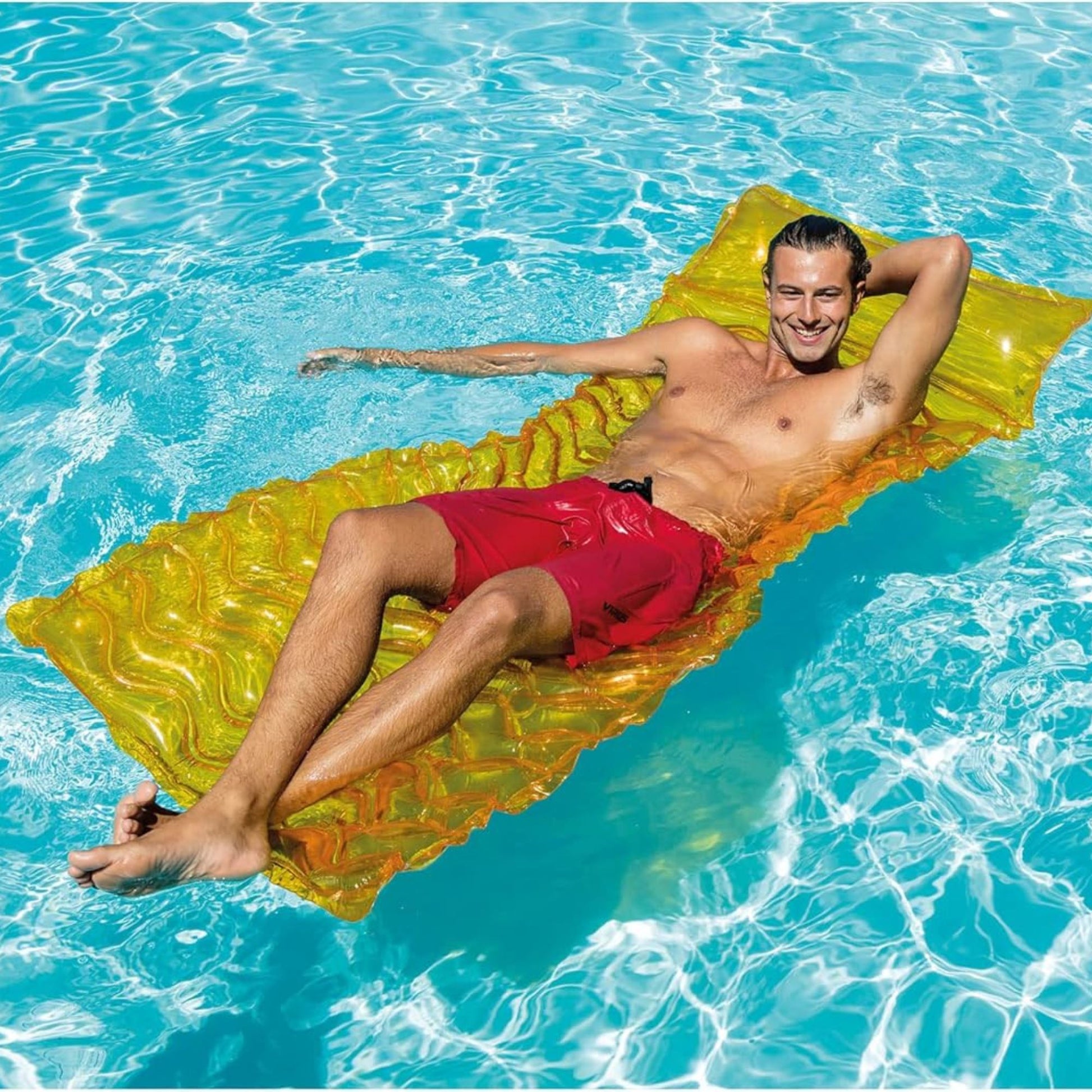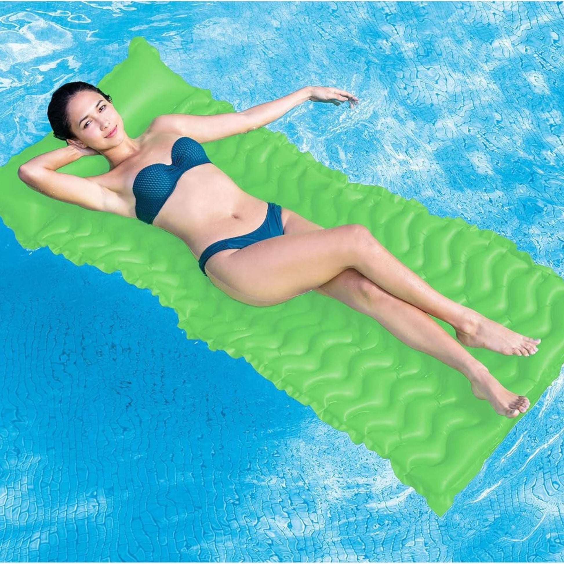 Relax and float in comfort with the Tote-N-Float Wave Mat. This pool lounger is easy to roll up and take anywhere, making it perfect for the pool or lake. It features two air chambers, double-sealed edges, and a built-in pillow rest for extra relaxation. Available in bright colors, this durable vinyl float is designed for one person and supports up to 250 pounds.
