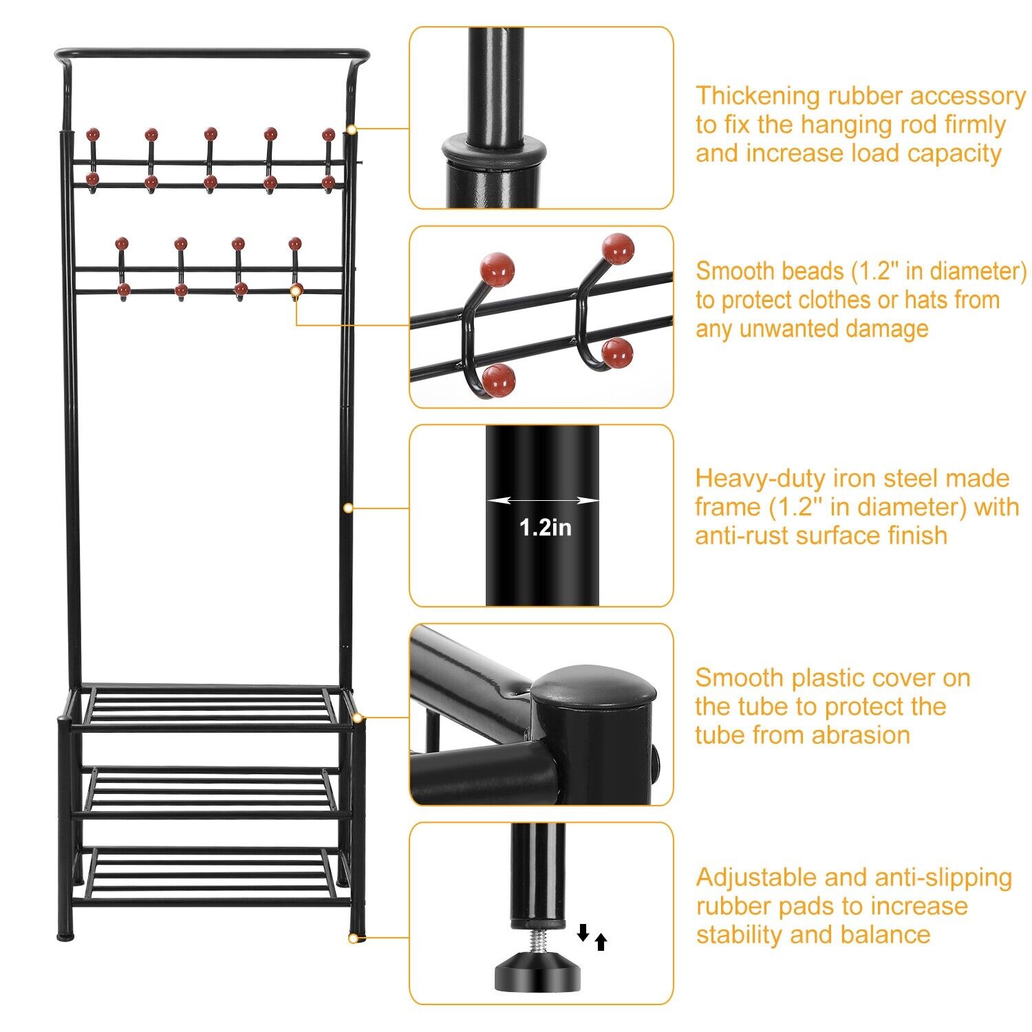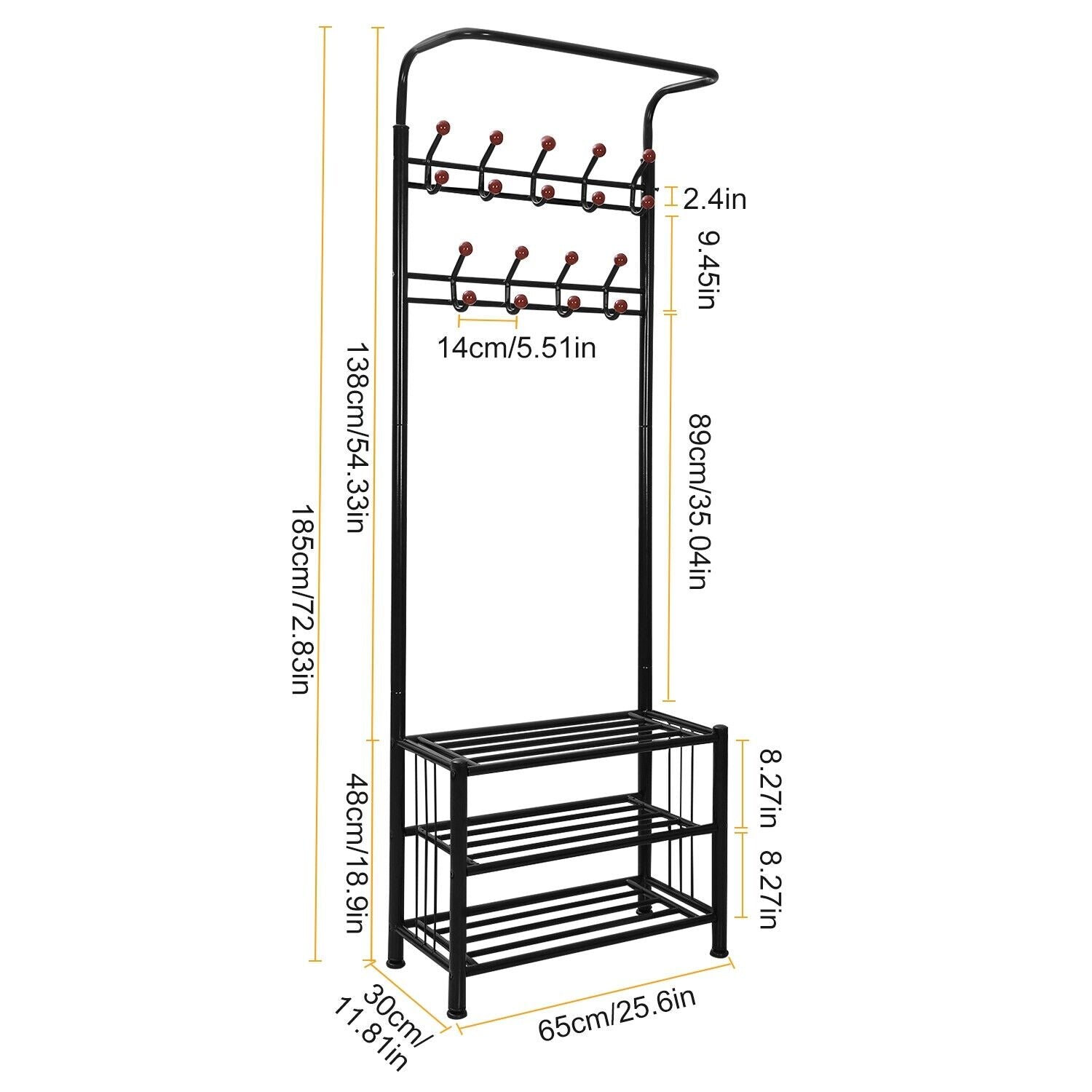 Our rack especially adopts a multi-purpose combination of coat rack, shoe rack and hanging rod to save space and keep neat and tidy of your living room, bedroom and office. It owns 18pcs metal hooks (can load up to 4.4lbs objects per hook) to hang various clothes, hats, scarves, bags, umbrellas, etc. and 3-tier metal shoe rack (25.6-inches-long and 11.8inches-wide and can bear up to 6.6lbs objects per tier) to organize shoes, boxes, potted plant, books, magazines, etc.