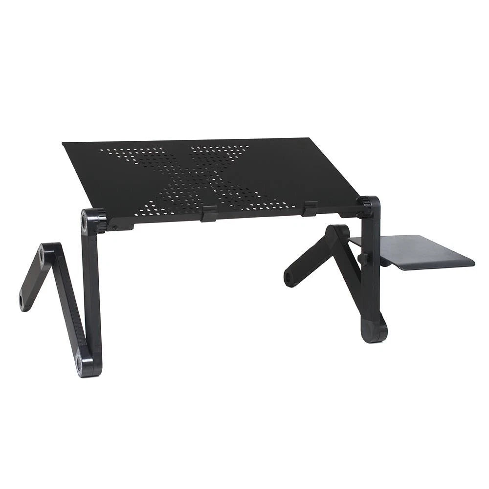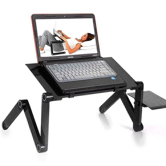 This is a portable and versatile folding computer desk that can be placed on a desk to be a standing desk, or on a bed or anywhere you want to use your laptop comfortably! You can also put books or tablets to free your hands. The foldable table legs can be rotated 360 degrees. Lock the position at different angles. Press the adjustment knob to adjust the angle. The knob has a scale for you to confirm the angle and adjust balance of the table. The legs are made of aluminum alloy, which is durable and flexible. There is a fan under the table, which can help your electronic equipment dissipate heat and improve its service life.