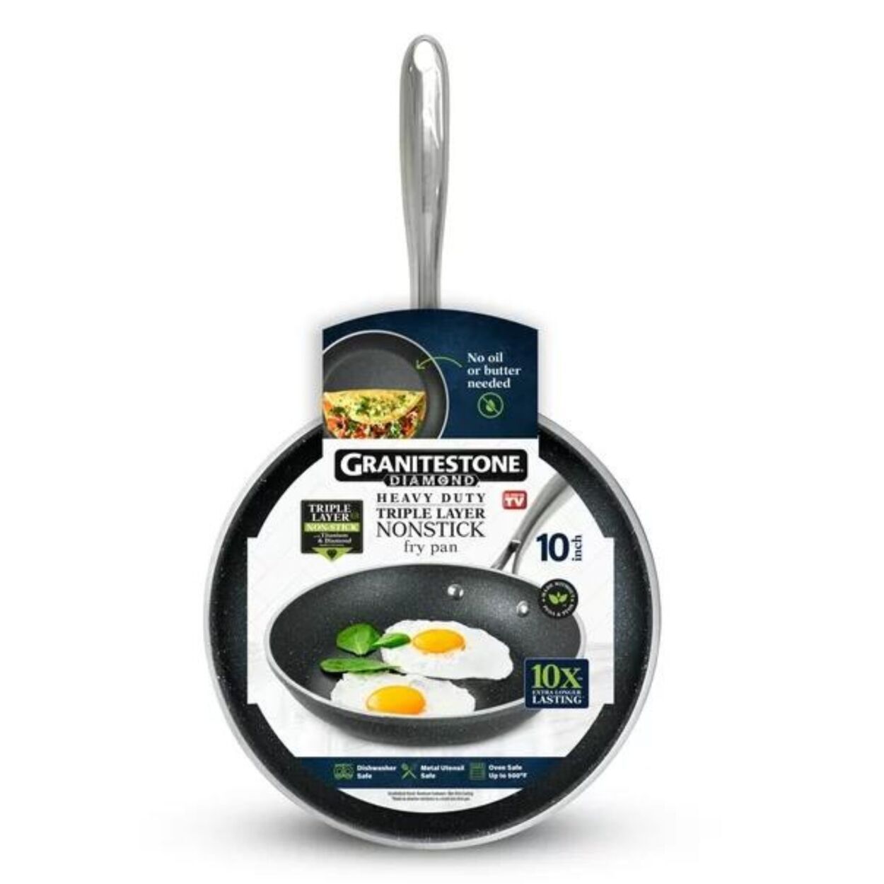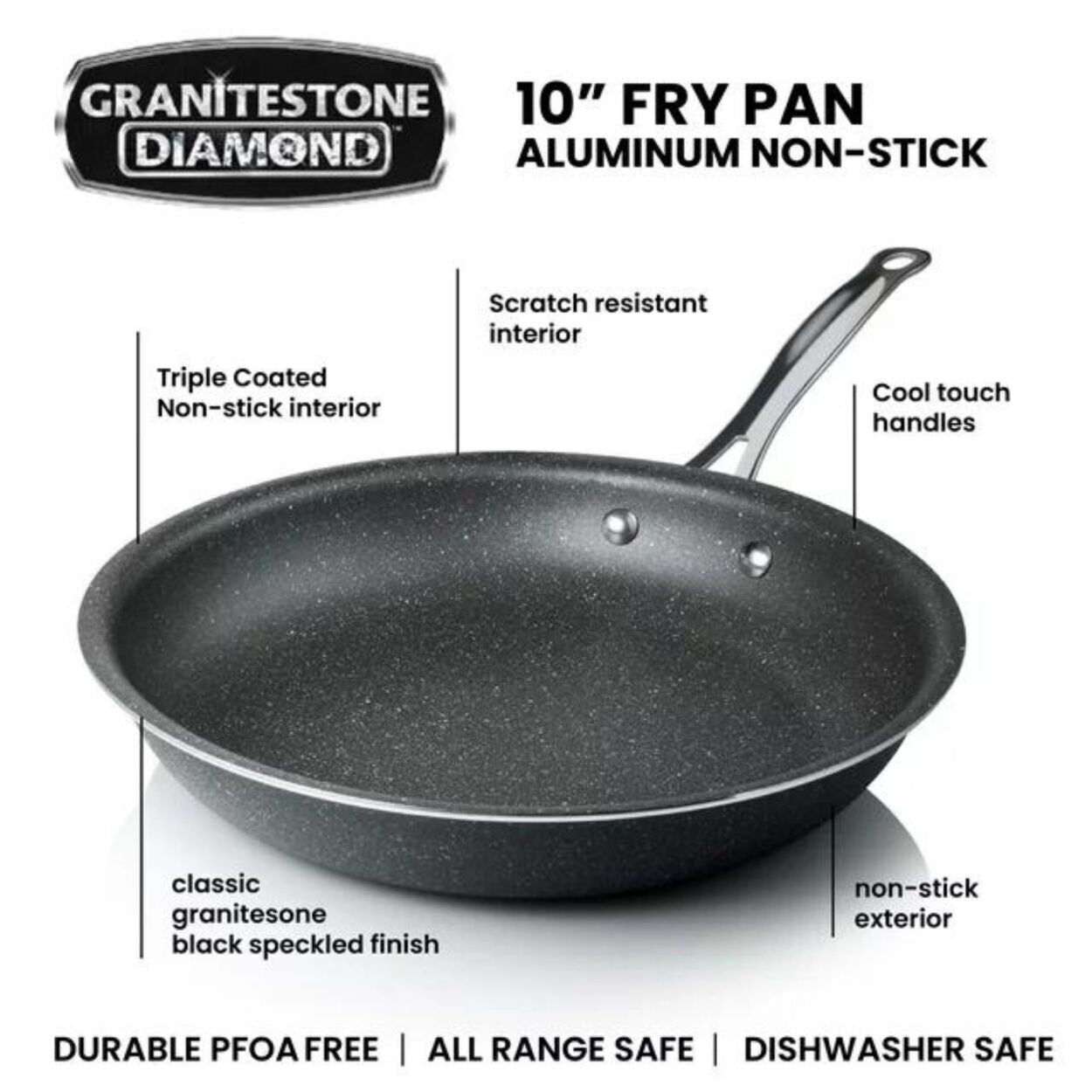 Discover the innovation of Granite Stone cookware, boasting a mineral-infused granite coating that seamlessly blends nonstick performance, durability, and user-friendliness. Crafted from a single sheet of aluminum and triple-layered with our proprietary coating, this cookware guarantees a hassle-free cooking experience without the need for oil. The robust, scratch-resistant, and metal utensil safe design ensures longevity, while the sleek speckled exterior complements any kitchen decor. Here are the key features: