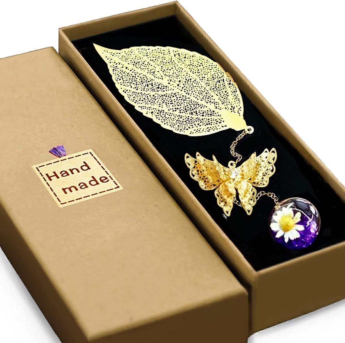 Handmade Bookmark, the perfect gift for book lovers and special occasions. Each bookmark comes in an exquisite gift box package, making it a unique and thoughtful present for teachers, colleagues, friends, or family members. The creative handmade design features a metal leaf with a realistic 3D butterfly and a dried flower bead pendant, adding a touch of elegance to any reading experience. Whether it's for teacher appreciation, birthdays, Christmas, Valentine's Day, or Mother's Day, Aimfar bookmarks are the ideal choice.