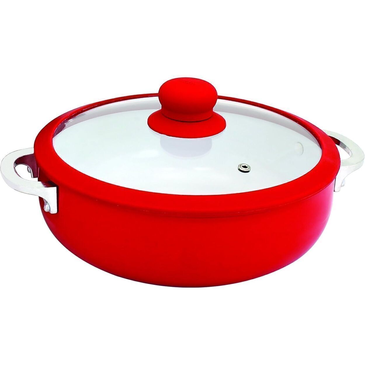 This newly designed caldero is made from durable aluminum and features a bright red exterior with a ceramic nonstick white interior. It includes a glass lid with a steam vent that allows you to monitor your food as it cooks. The silicone rim on the lid ensures a tight seal, locking in flavor. This kitchen essential is ideal for making rice, beans, soups, stews, and more.