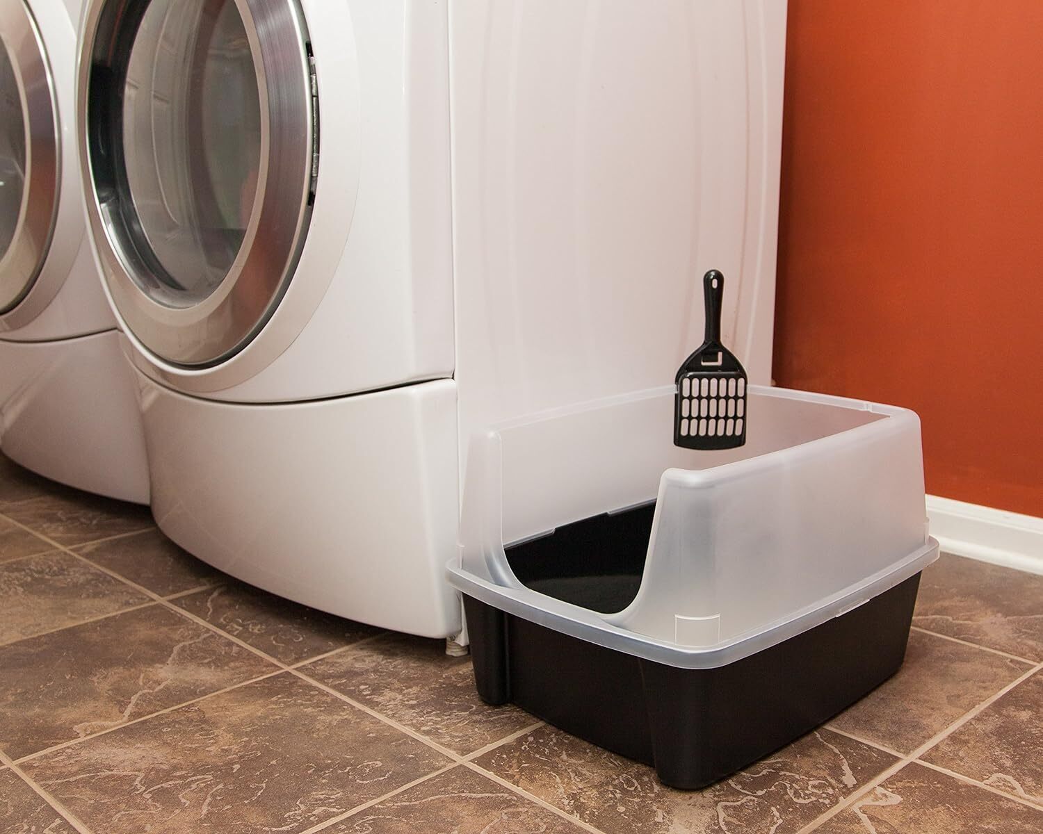 The IRIS USA Open-Top Cat Litter Box in Black, equipped with a shield and scoop, features extra-tall walls on three sides to contain litter and prevent spray, while keeping dirt out. The open-top design ensures quick and easy access for cats, providing a semi-private space with its deep litter pan.