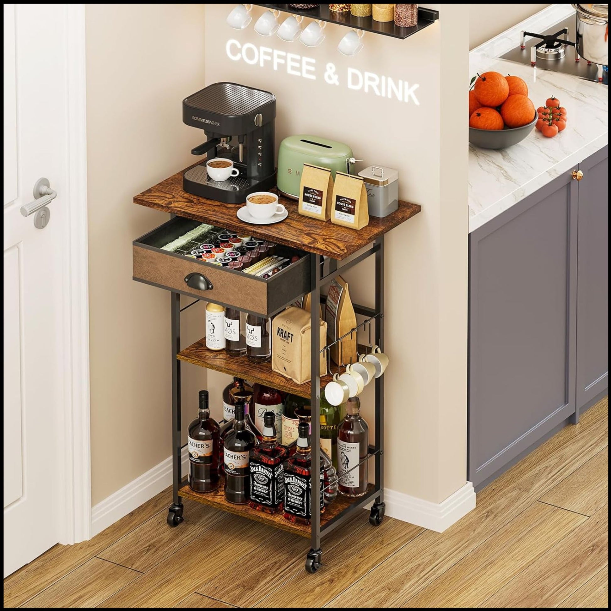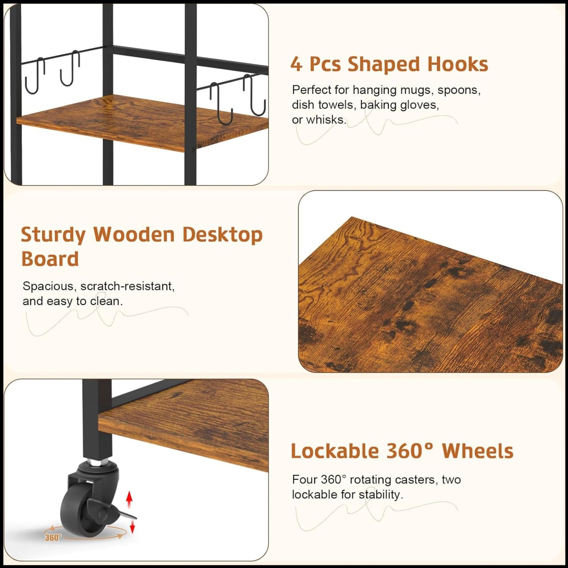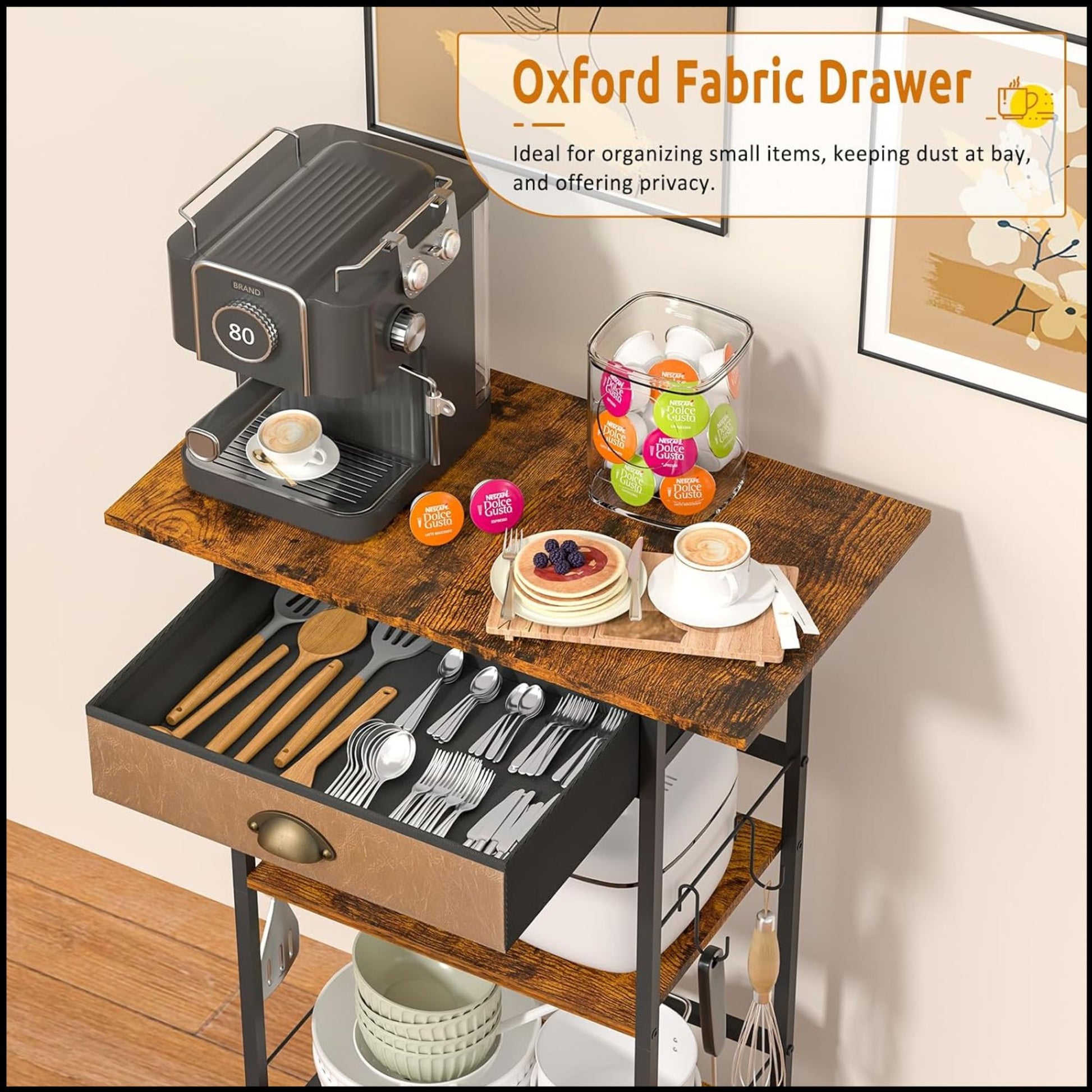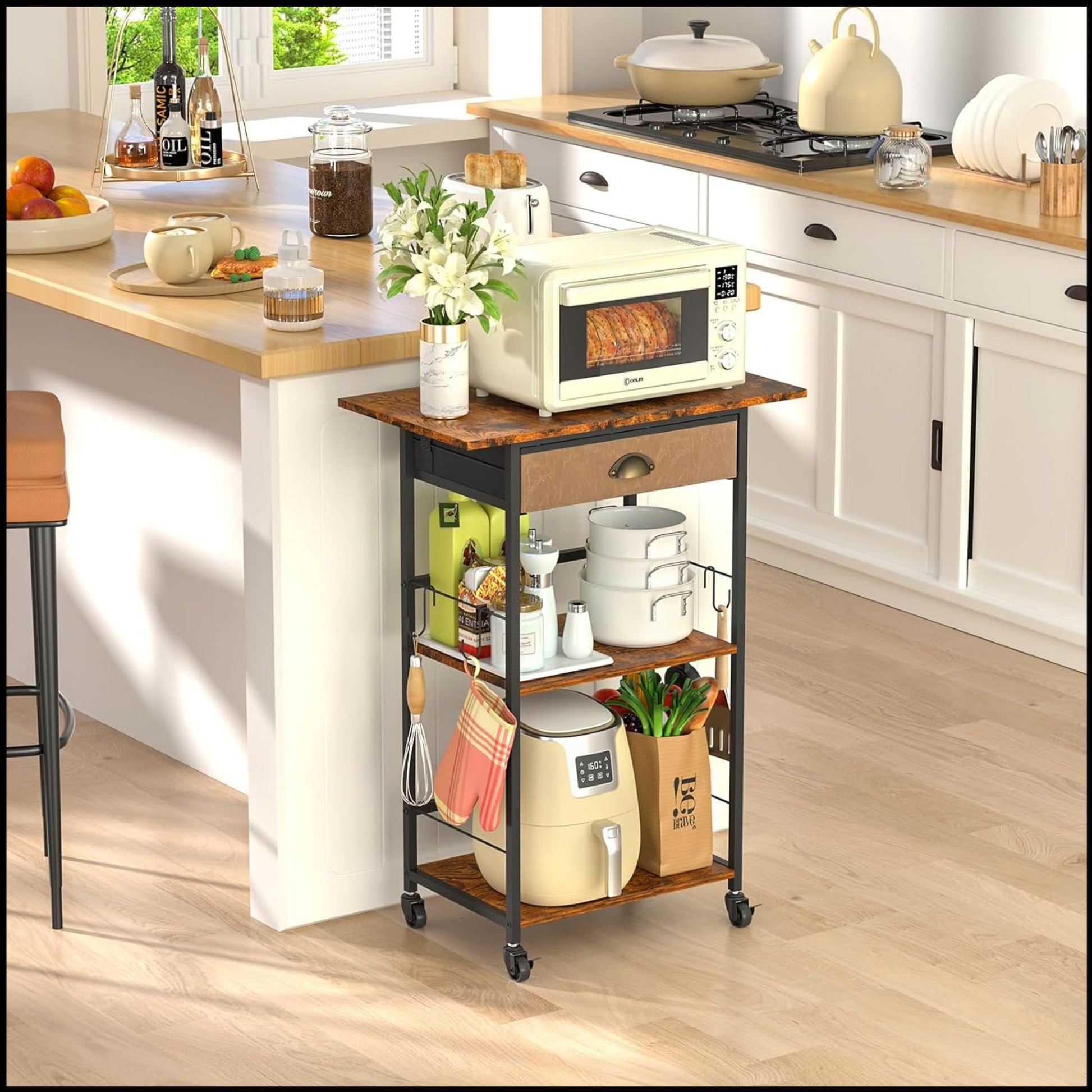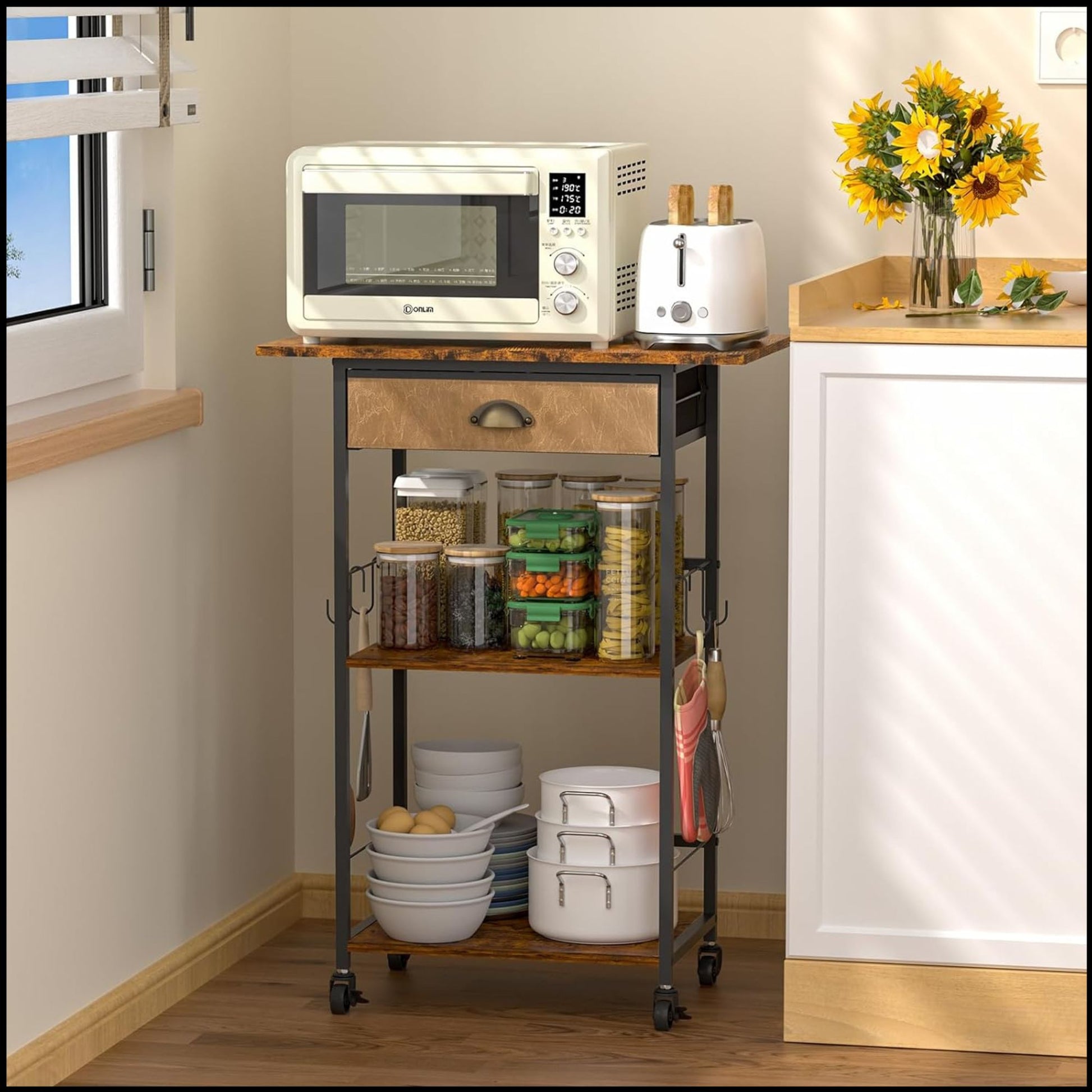 This 3-tier microwave cart provides extra storage space for your kitchen. It features a spacious tabletop, two shelves, a drawer, and four hooks to keep essentials organized. The sturdy design holds a microwave, coffee maker, toaster, or cookware. With four rolling wheels, including two with locks, it moves easily and stays in place when needed. Made from durable MDF and iron, this cart is perfect for kitchens, dining rooms, offices, or even as a coffee station. Assembly is quick and simple.