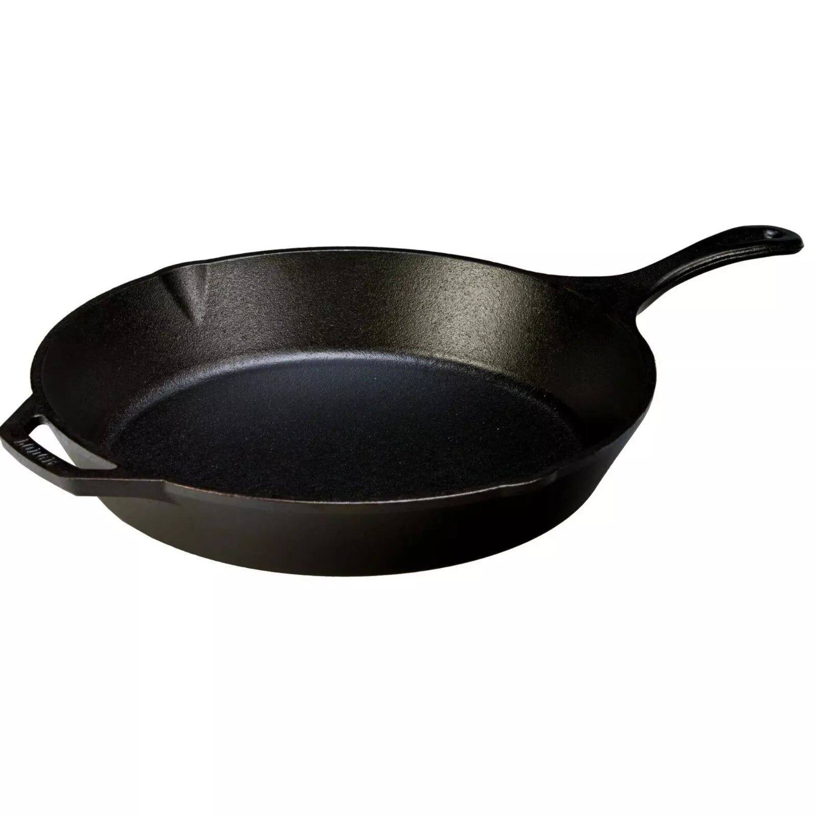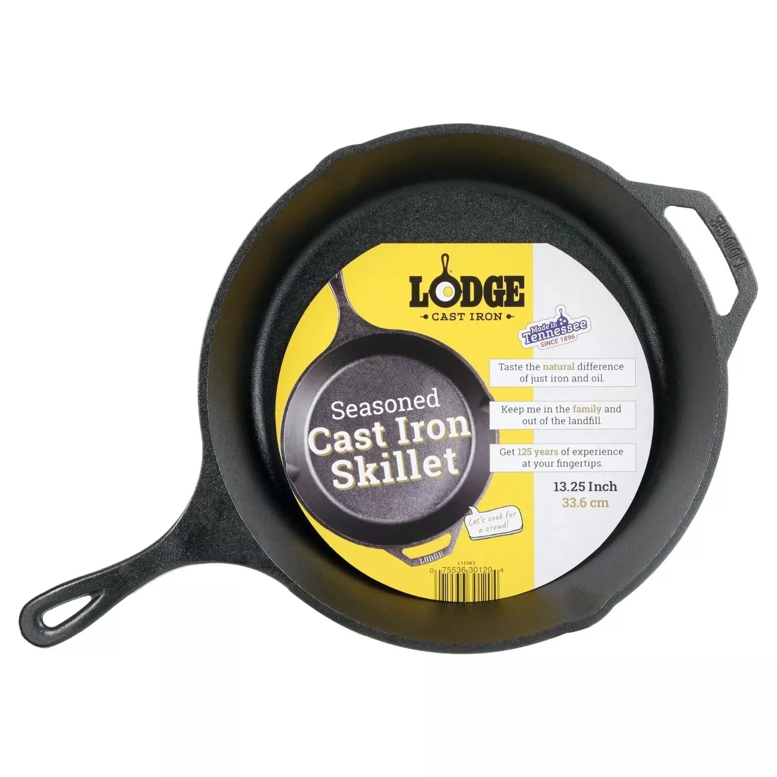 The Lodge Seasoned 13.25-Inch Cast Iron Skillet is a must-have for any kitchen. Made with just iron and natural oil, it has a nonstick surface that gets better the more you use it. It heats evenly and holds heat well, making it great for grilling, sautéing, baking, or frying. It also has a helper handle for easy lifting and hanging.