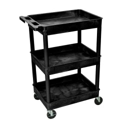 Features: Molded plastic shelves and legs will never rust, dent, scratch or stain HDPE (high-density polyethylene) shelves; PVC square legs Shelves safely transport goods in 2.5” deep tub area Ergonomic push handle molded into top shelf Four 4” full-swivel casters with two locking brakes; available with 5” heavy-duty casters Holds up to 400 lbs. (500 lbs. with heavy-duty casters) Available in black and gray.