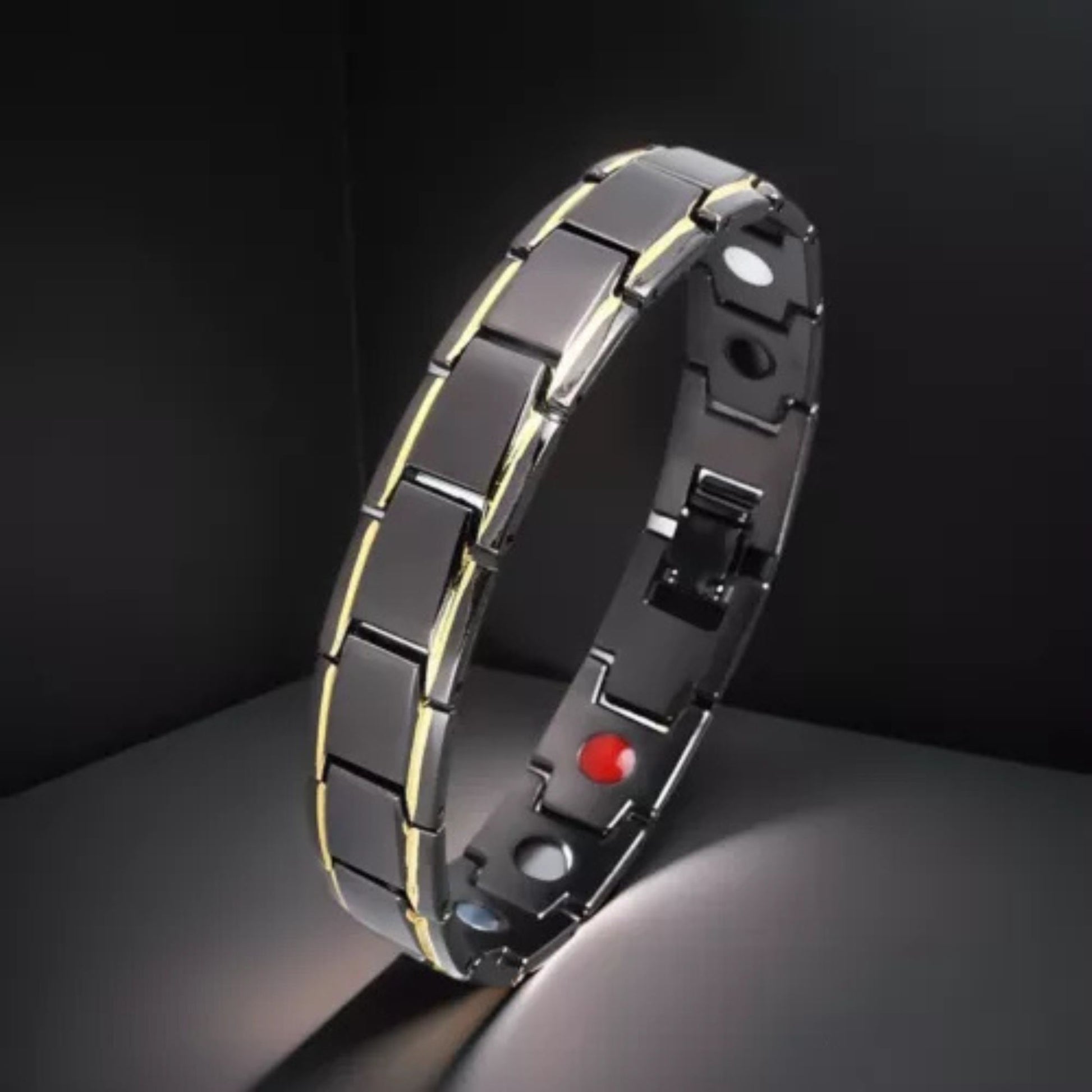This magnetic energy healing bracelet is made from hypoallergenic titanium steel, ensuring comfort and safety for all skin types. Designed for both men and women, it features a stylish, elegant look that complements any outfit. The bracelet is adjustable for a perfect fit and combines four health elements—Magnet, Far Infrared Ray, Negative Ions, and Germanium Powder—to promote overall wellness and relaxation.