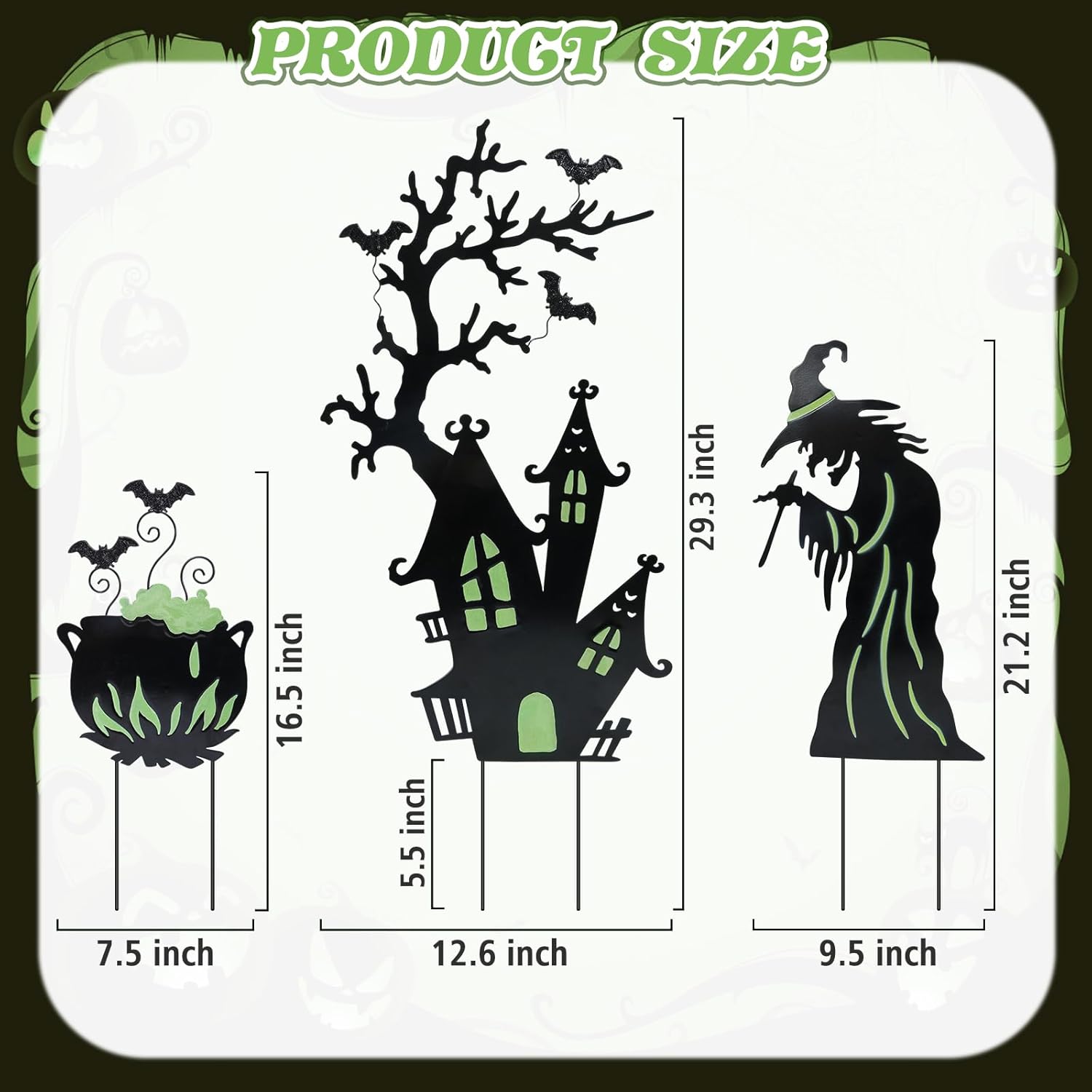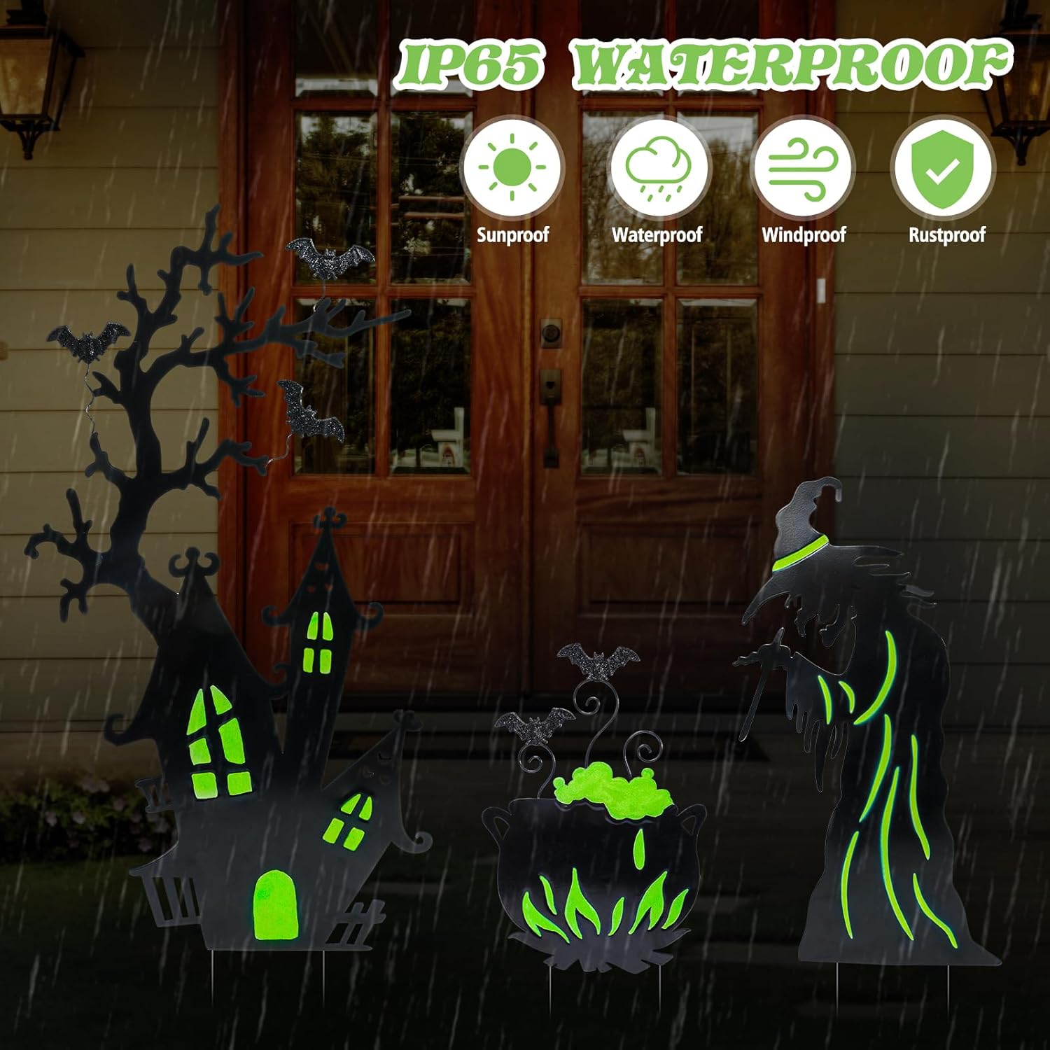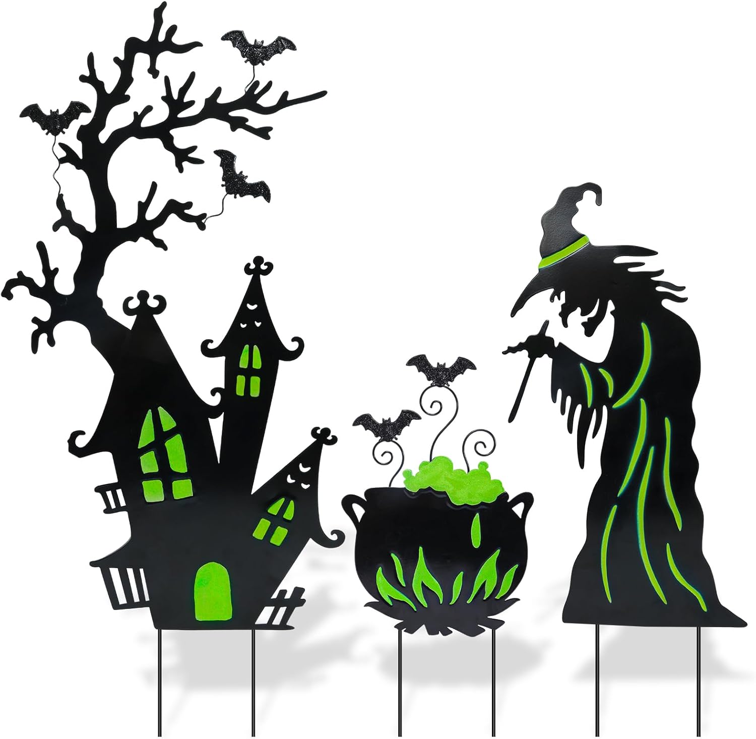Add a spooky glow to your yard this Halloween with this set of 3 Halloween yard stakes. Featuring a witch, cauldron, and gloomy castle, each piece is decorated with fluorescent details that emit a creepy green light at night. These haunting silhouettes are perfect for creating eerie shadows in your yard or windows, instantly setting the mood for Halloween night. Made from durable, weather-resistant metal with anti-rust coating, these decorations are built to last for years of festive fun. Easy to assemble and store, they make the perfect addition to your garden, lawn, or pathway.