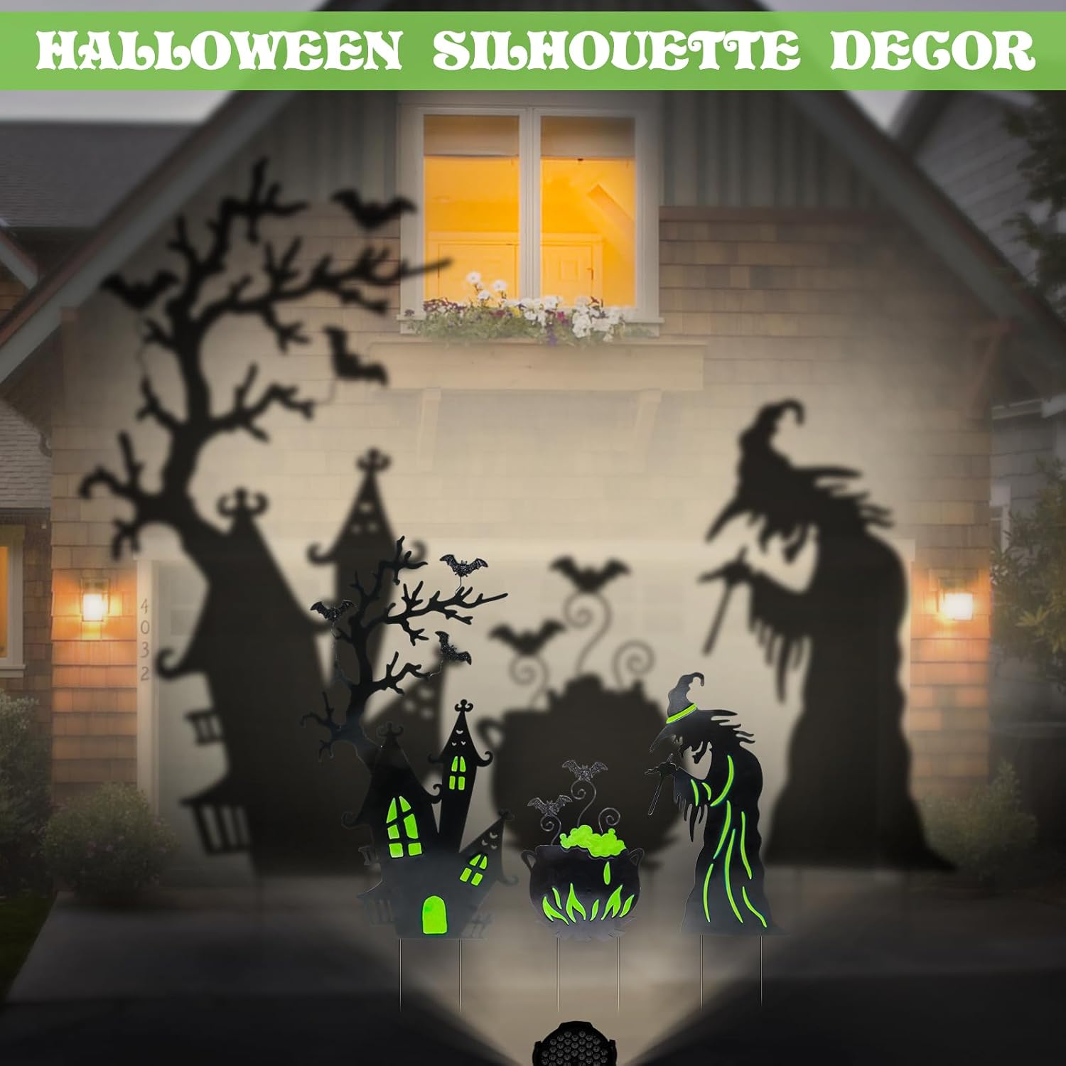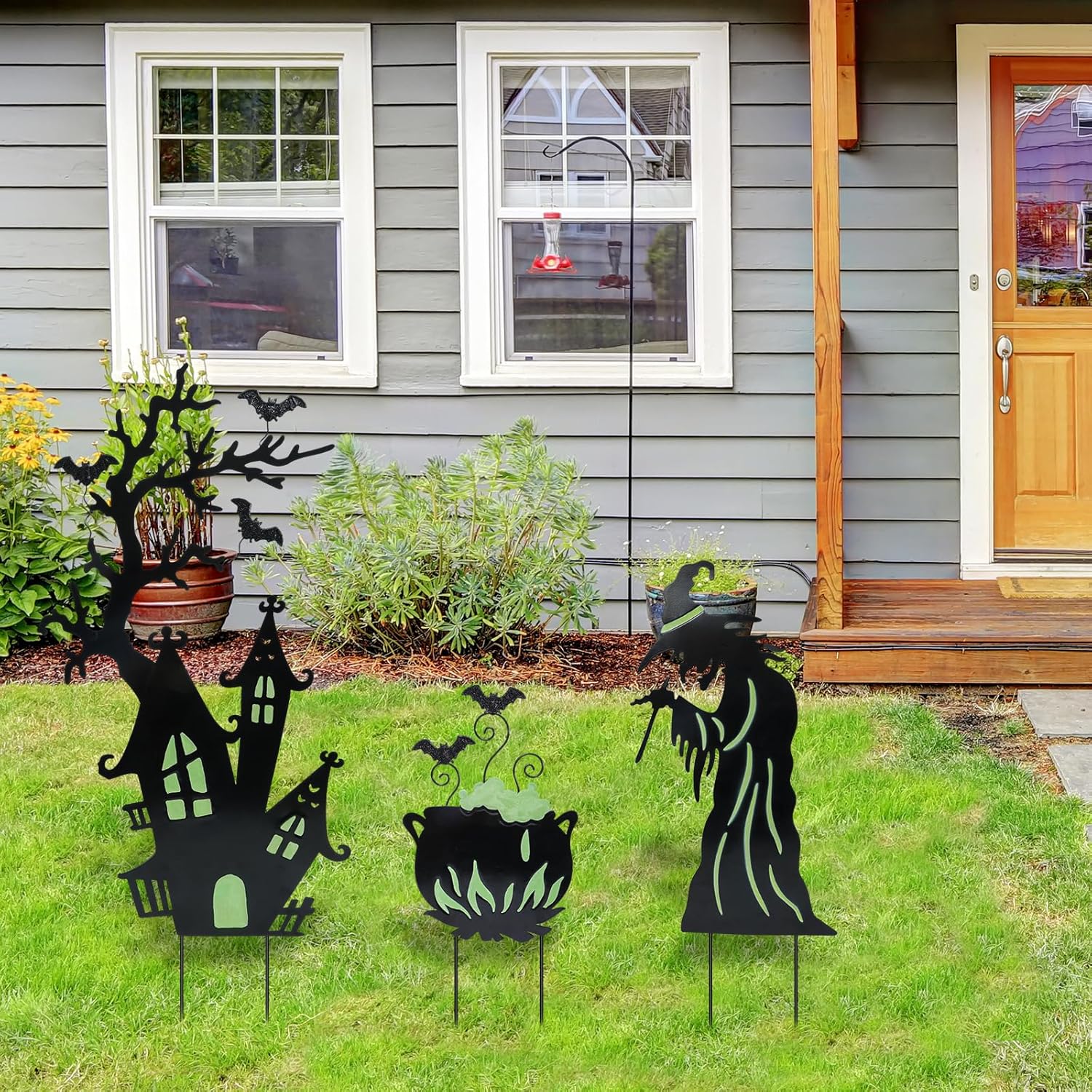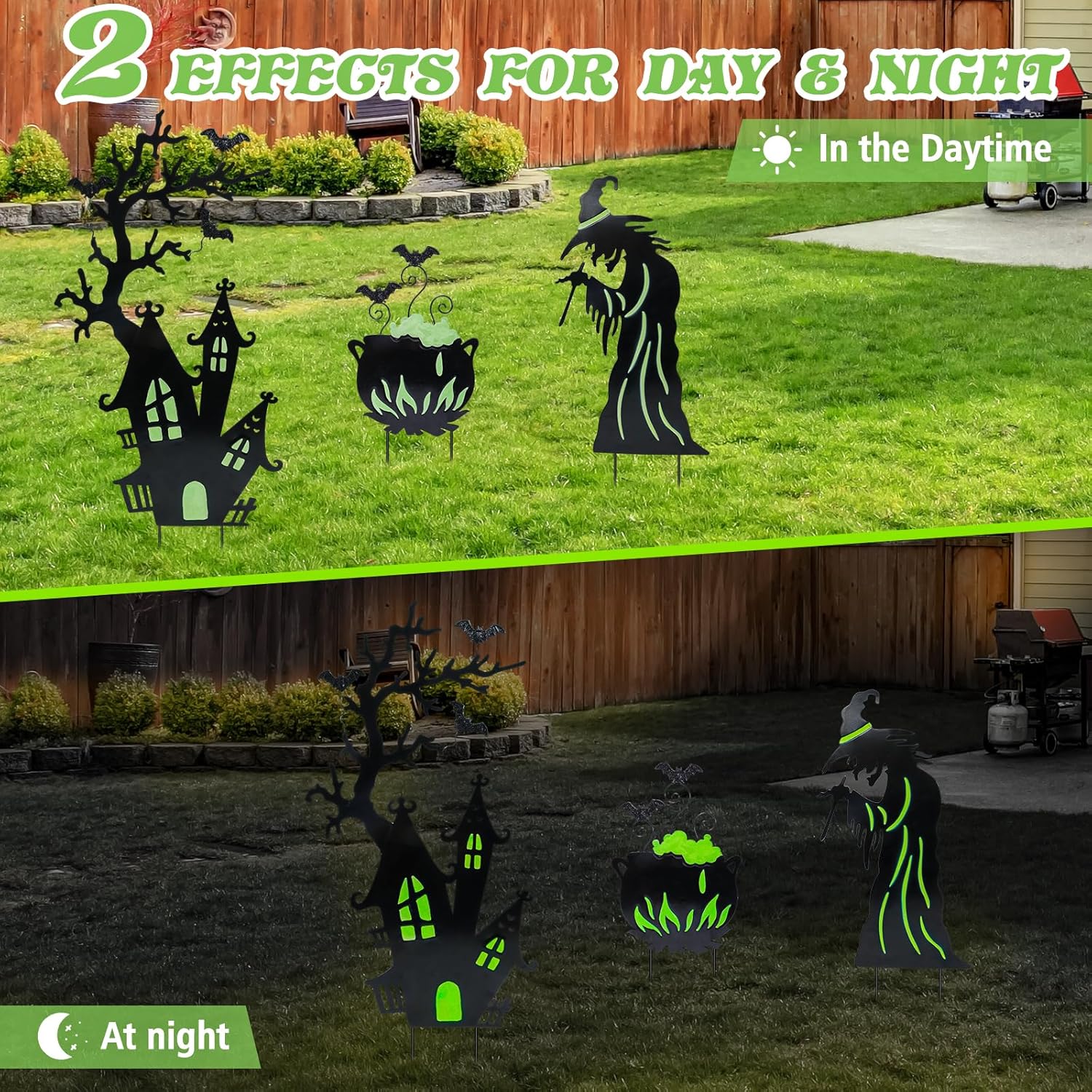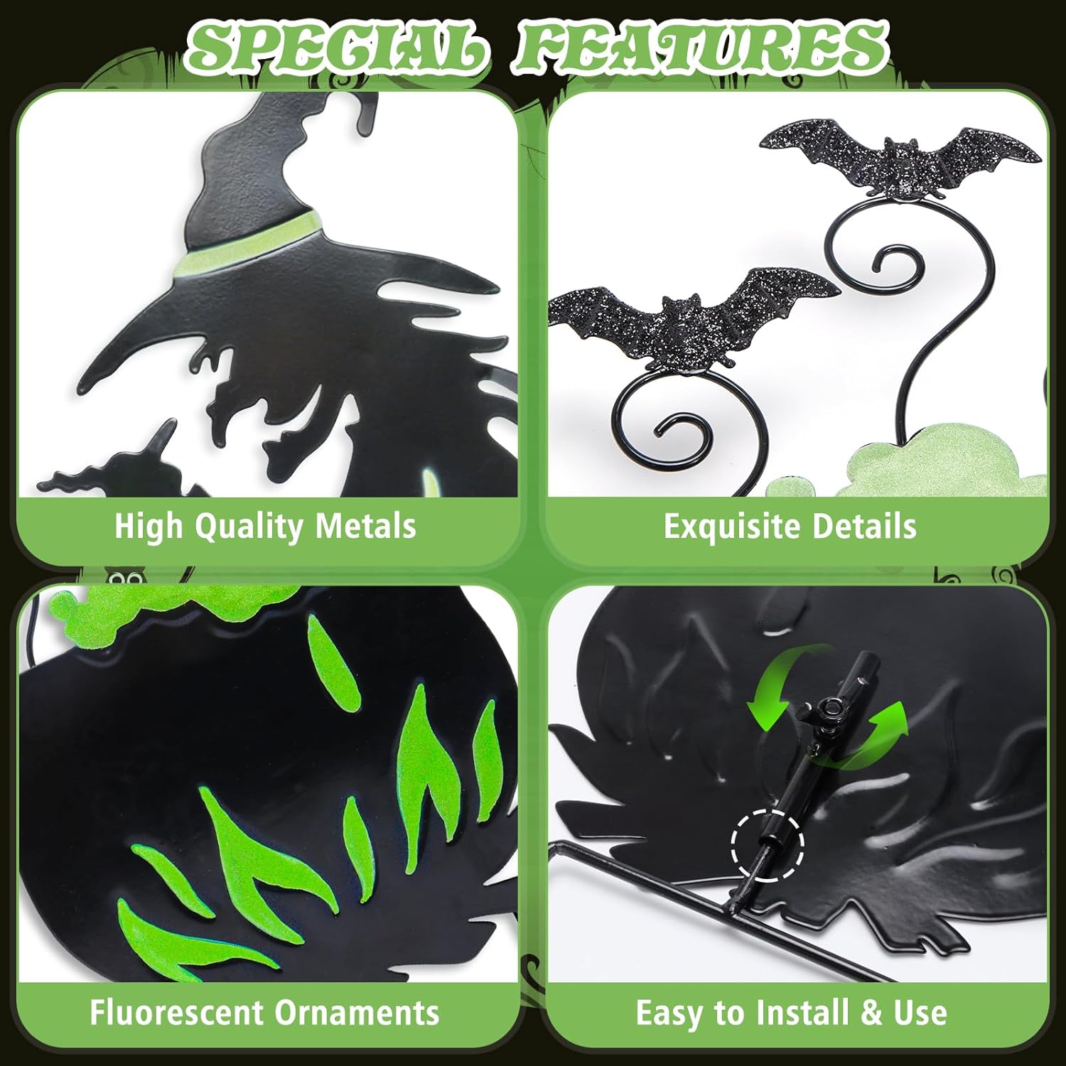 Add a spooky glow to your yard this Halloween with this set of 3 Halloween yard stakes. Featuring a witch, cauldron, and gloomy castle, each piece is decorated with fluorescent details that emit a creepy green light at night. These haunting silhouettes are perfect for creating eerie shadows in your yard or windows, instantly setting the mood for Halloween night. Made from durable, weather-resistant metal with anti-rust coating, these decorations are built to last for years of festive fun. Easy to assemble and store, they make the perfect addition to your garden, lawn, or pathway.