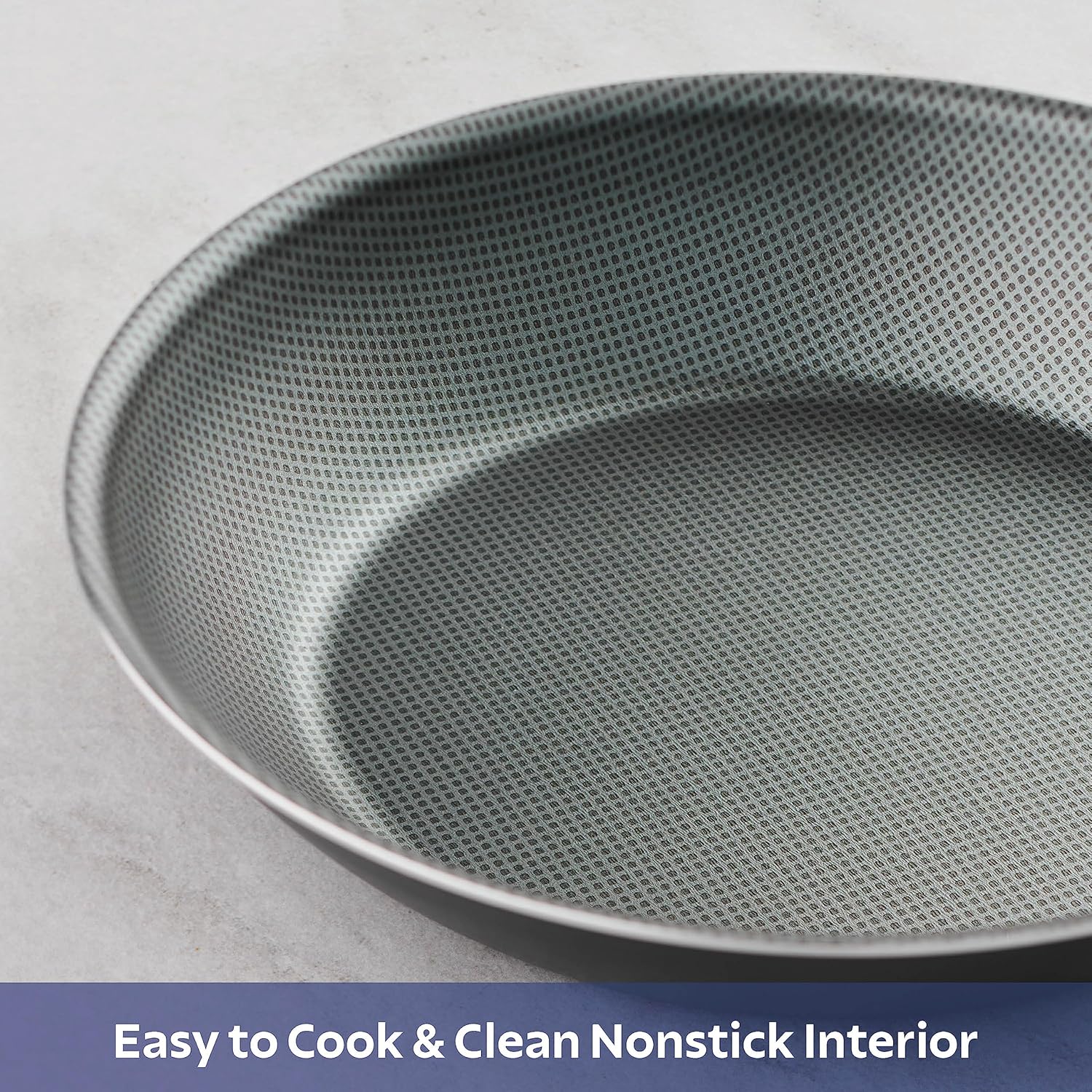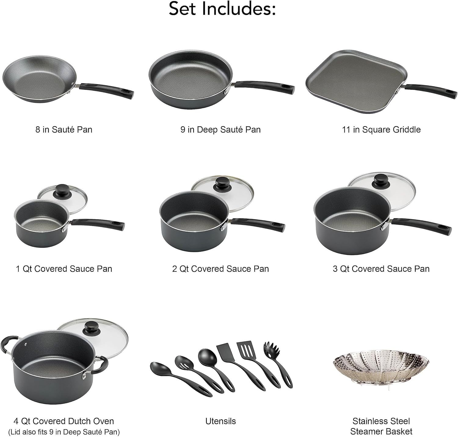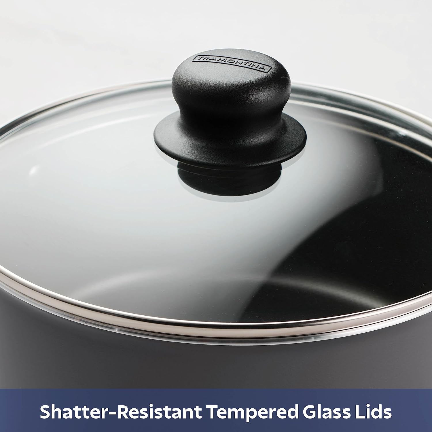 Tramontina's PrimaWare 18-Piece Nonstick Cookware Set, featuring a patterned gray interior non-stick coating for effortless cooking and cleaning, riveted stay-cool handles, and heat- and shatter-resistant tempered glass lids, offers all the essential tools for cooking and is an ideal starter set; dishwasher-safe and compatible with gas, electric, and ceramic glass cooktops.