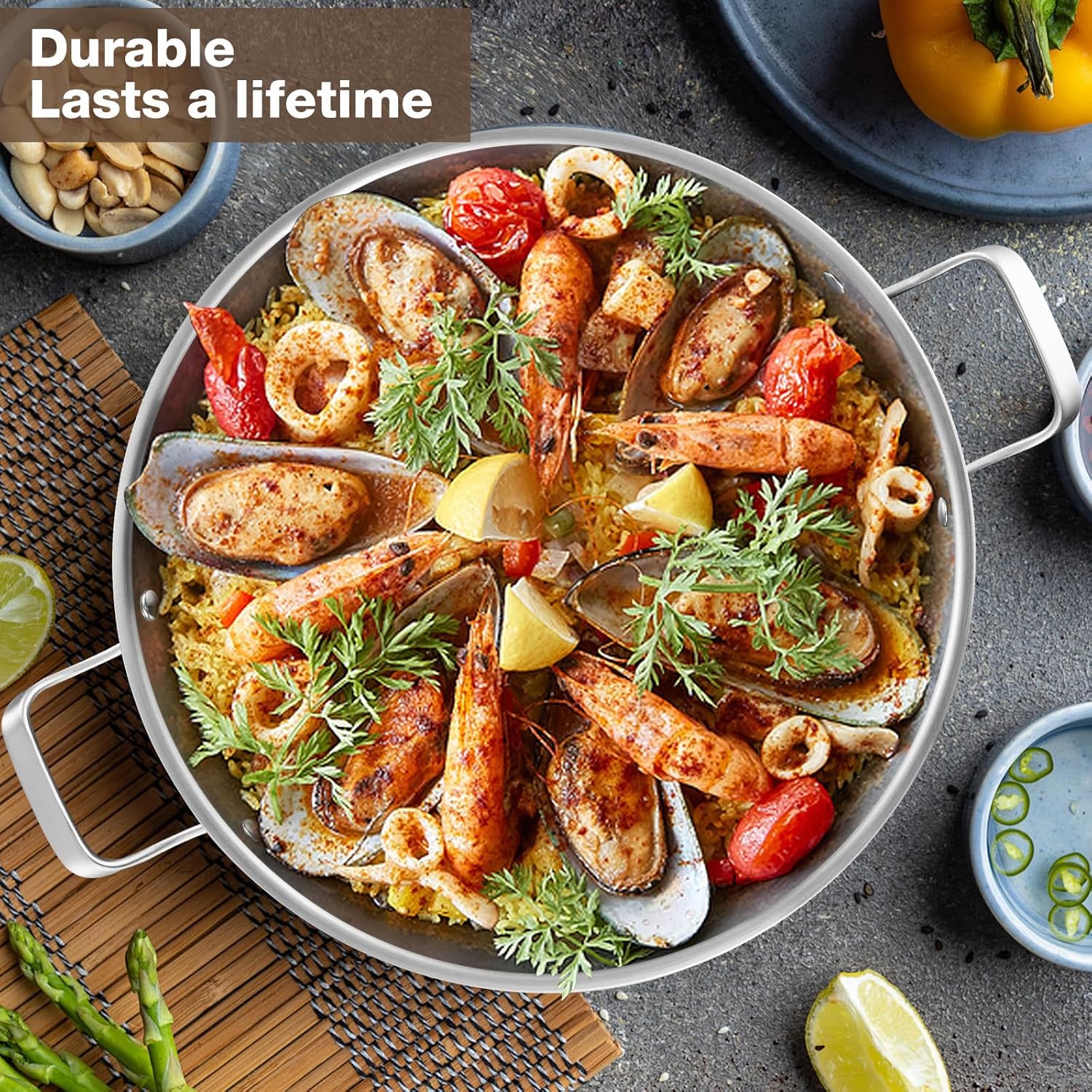 Elevate your cooking experience with our high-quality Stainless Steel Paella Pan, designed for durability, performance, and authenticity. Crafted from premium stainless steel, this pan is corrosion-resistant, highly durable, and safe for healthy cooking. Its tri-ply construction, featuring a die-cast aluminum core, ensures quick and even heating, making it perfect for preparing up to 10 servings of your favorite Mediterranean recipes.
