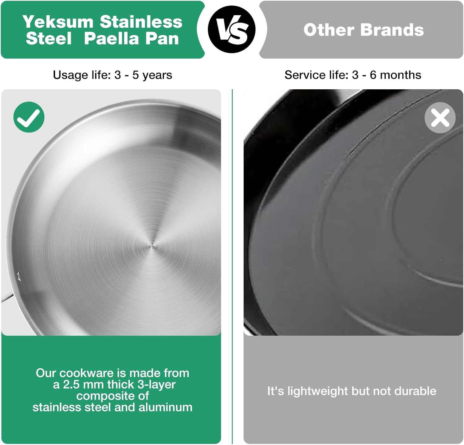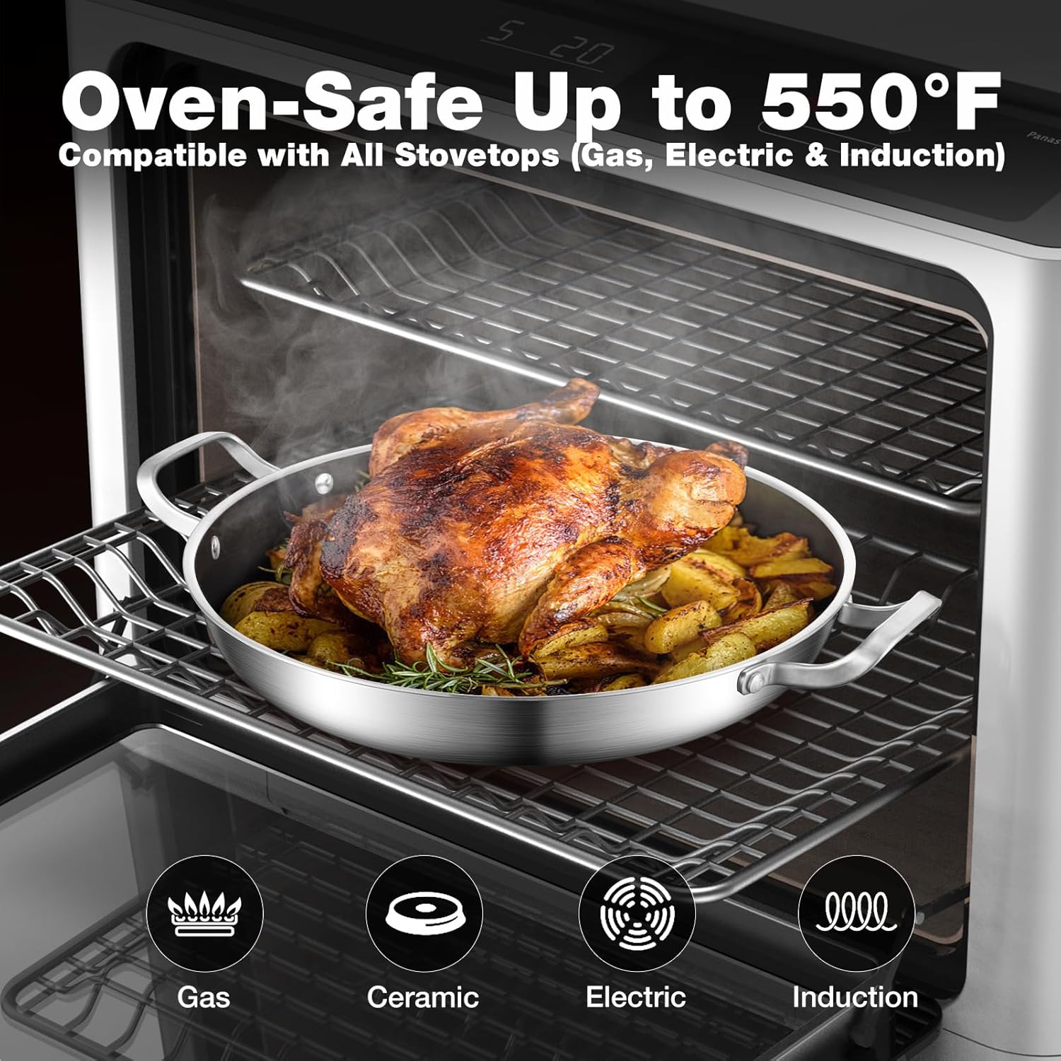 Paella Pan W/Lid Tri-Ply Stainless Steel Large Skillet, 13.5"