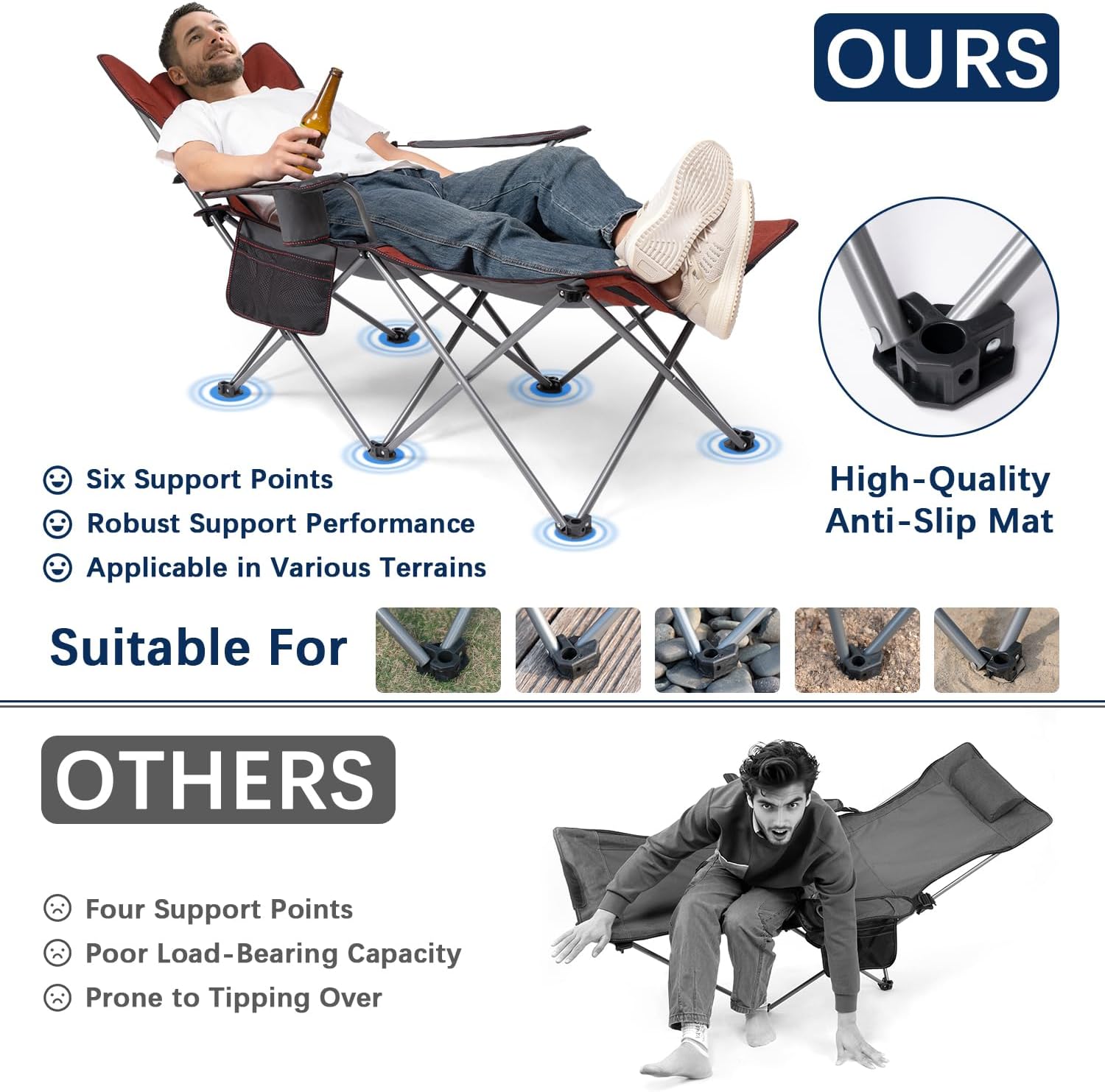 Built with a rugged steel frame and supported by six sturdy legs, this chair delivers excellent stability and a high weight capacity of up to 330 lbs. The non-slip feet and durable 600D Oxford fabric ensure safety, longevity, and comfort. The breathable material is soft to the touch, wear-resistant, and easy to clean—perfect for outdoor use.