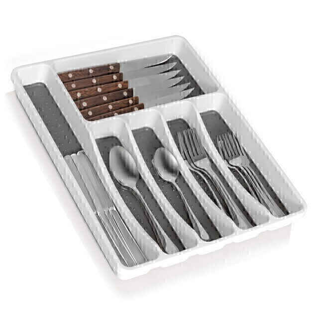 Organize your kitchen drawers with our high-quality silverware tray. With six compartments, this tray provides ample storage for all your utensils, from silverware to cooking cutlery. The tray is made of durable plastic and features non-slip rubber feet and linings to keep items securely in place. The unique rounded corners design makes it versatile and perfect for any room in the house. Cleaning is a breeze, simply wipe with a sponge or towel. Our tray fits most drawers, but we recommend measuring before purchasing.