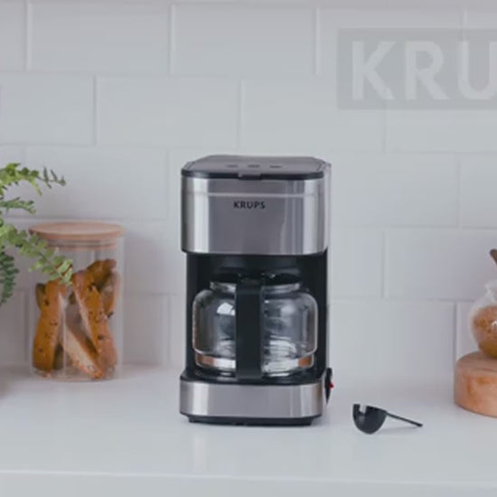 The KRUPS Simply Brew Compact Filter Drip Coffee Maker in silver is ideal for small families, offering a 5-cup capacity perfect for households of 1 or 2 people, all in a sleek and modern design. Enjoy convenient features like Pause & Brew for mid-brew pouring and automatic warming after brewing. It's easy to use with a simple On/Off button and a no-drip spout.