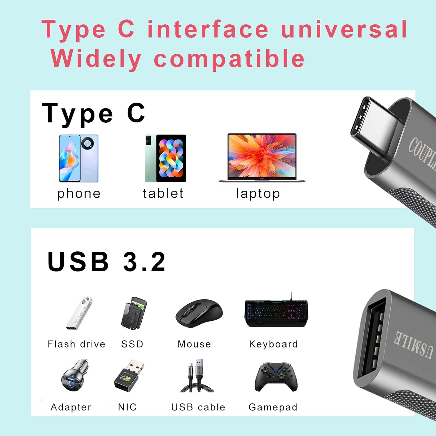 This USB-C to USB-A adapter supports high-speed data transfer rates up to 10Gbps and delivers stable, safe charging performance thanks to its intelligent chip. It's OTG-compatible, letting you connect USB accessories like flash drives, keyboards, and mice to your USB-C or Thunderbolt 3/4 devices. Enjoy effortless plug-and-play functionality with over 10,000 insertions tested for reliability.
