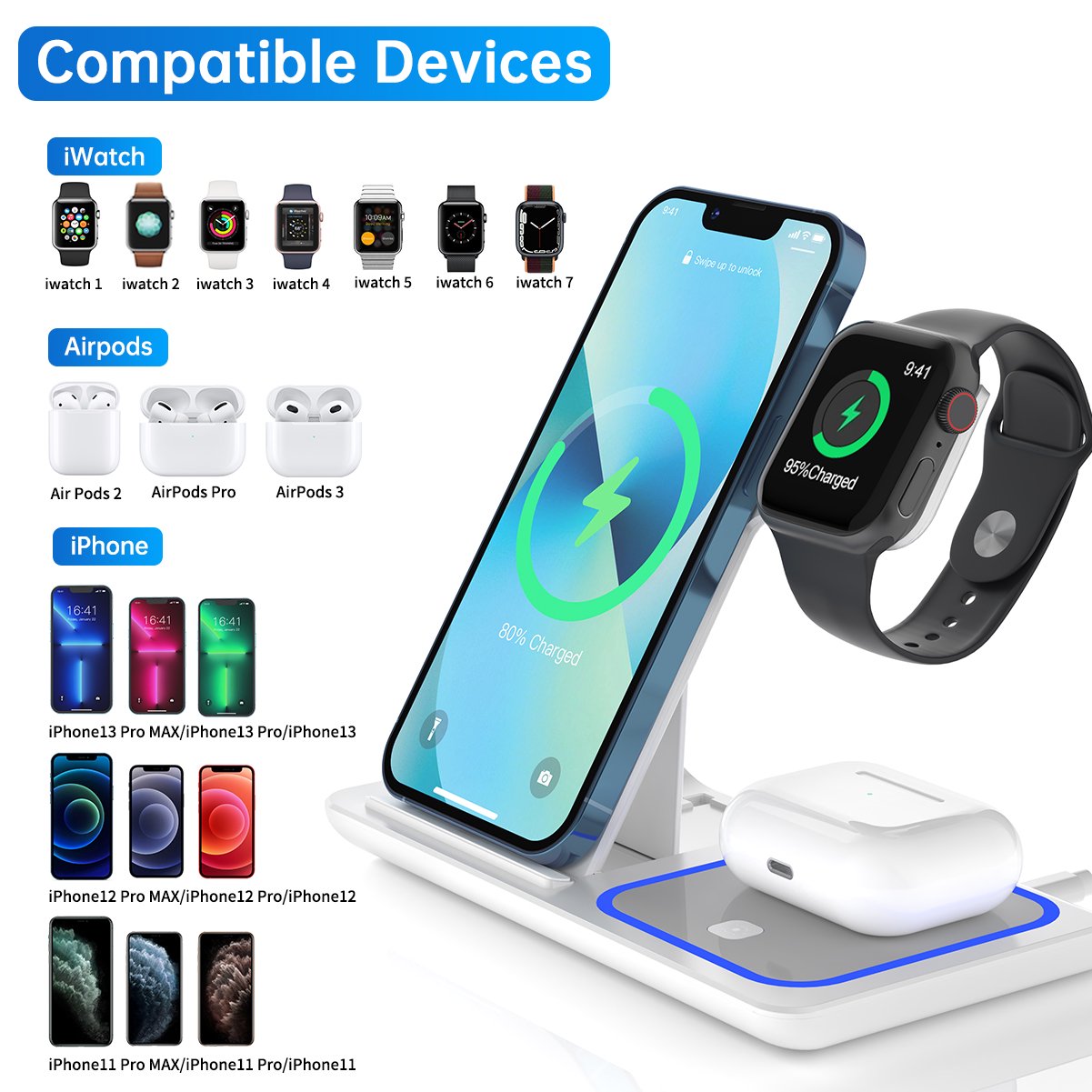The iPhone wireless charger is widely compatible, iPhone 13/12/11 Pro/11 Pro max/X/Xs/Xs Max/8/8 Plus, and it’s Samsung wireless charger for S20/S20+/S20, Note10/10+/9/9+/8/8+,Pixel 3/3+/4/4+, etc. And it’s compatible with iWatch Series 6/SE/5/4/3/2/1, AirPods 1/2/Pro, and some other Qi-supported devices.