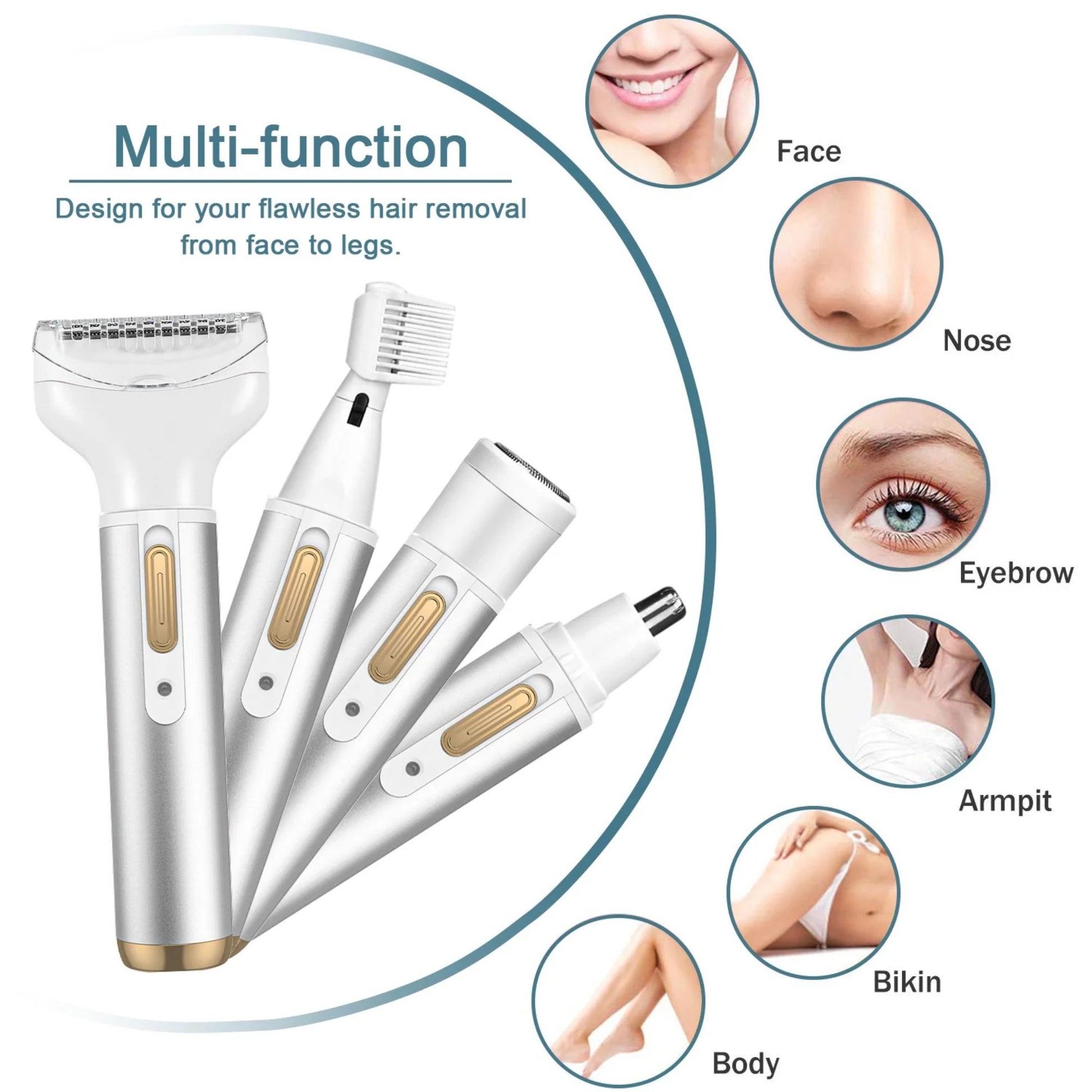 The 4 in 1 Hair Remover includes 4 interchangeable hair removal razor heads: nose hair trimmer, eyebrow trimmer, body shaver, beard trimmer and lady shaver, which can help you to remove unwanted hair , you can use on eyebrow, face peach fuzz, cheeks, upper lips, chin, neck, bikini line, arm, leg and other body area. And the one-button design is very easy to use anytime.