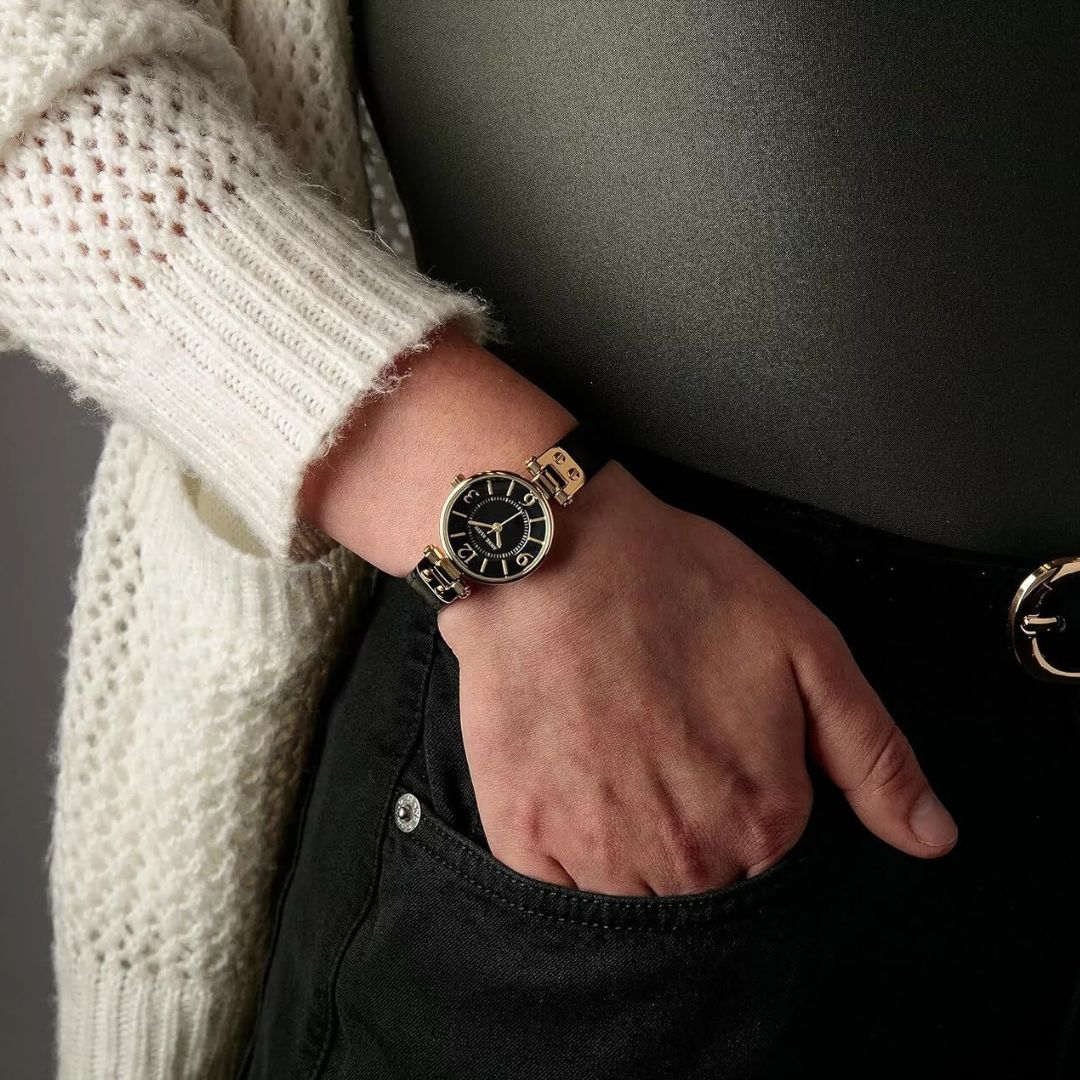 These watch feature a black dial with silver-tone hands and markers, housed in a 26-millimeter round case with a mineral crystal lens, powered by Japanese quartz movement, and paired with a black leather band with buckle closure; they're water resistant to 100 feet. They offer chic and classic style, comfort, and everyday charm. Additionally, classic styles are elevated with premium crystal accents, ceramic watches offer sleek durability, and watches with genuine diamond accents provide a chic, elevated evening look.